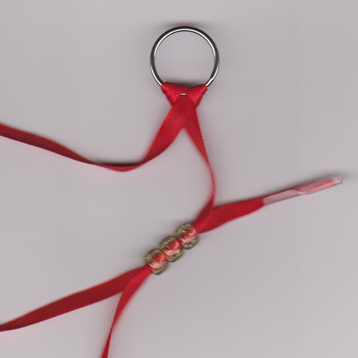 Step 1: Stiffen each end of the ribbon or cord with scotch tape. The ends should resemble aglets (the ends of a shoelace). This will make it easier to lace on the beads.