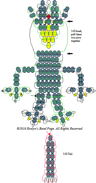 by lacing 3 beads onto one strand and weaving back through beads marked #1 &