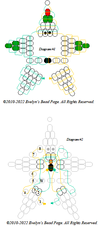 white bead marked W on the body, and through beads #3&2. Repeat on the